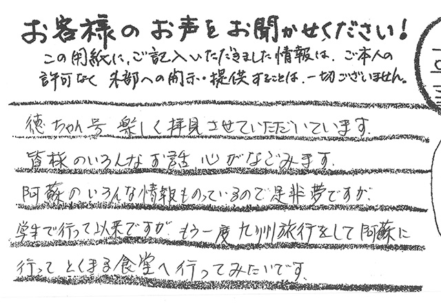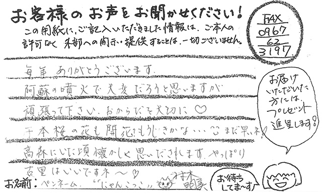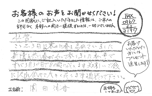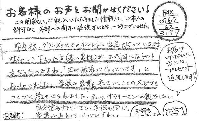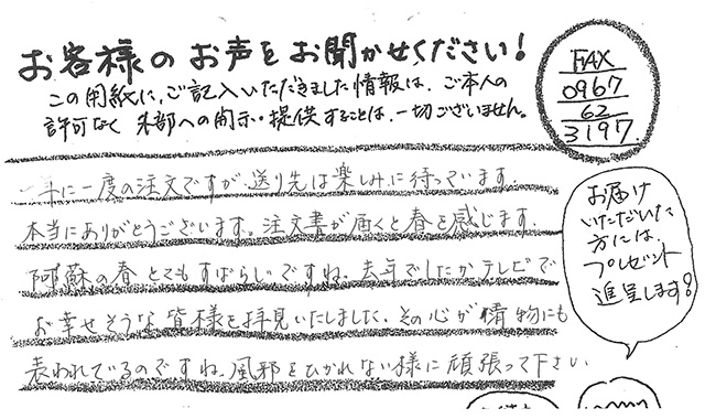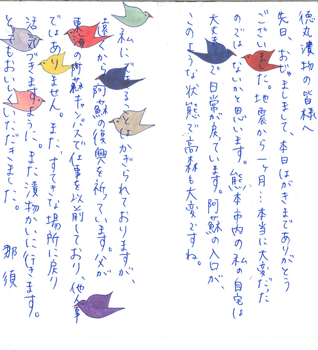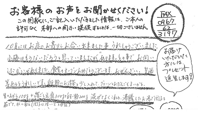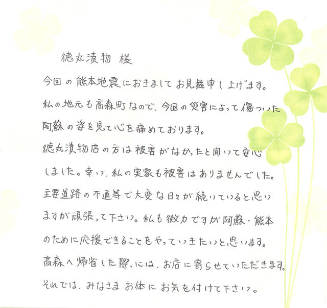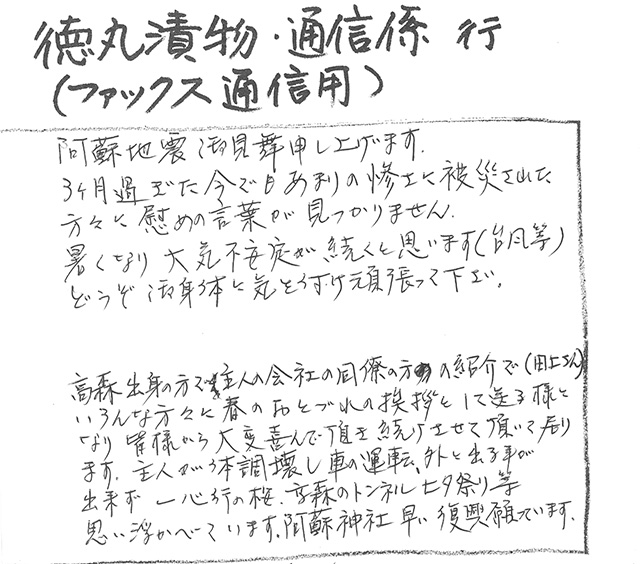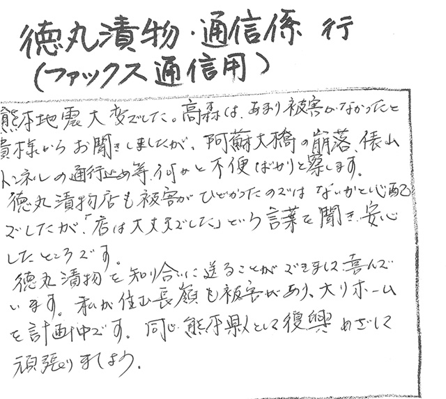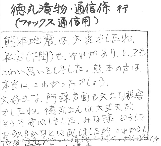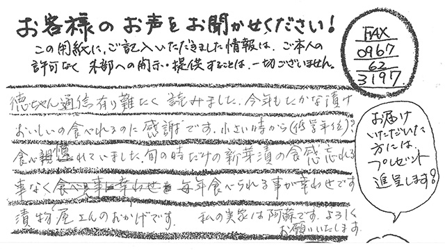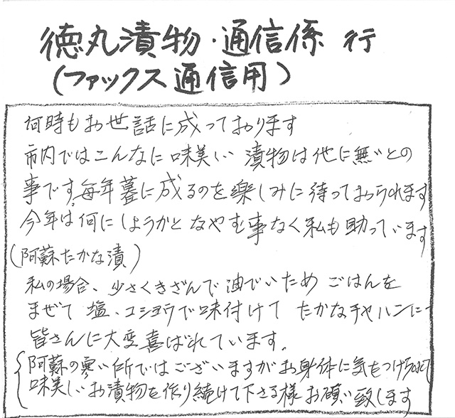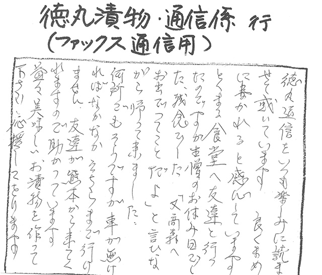 徳丸漬物は、製造はもちろん、販売まで全てを自社で行っています。 田舎作りのお店では多くのお客様が気軽にお声をかけてくださいます。 ここではそうしたお客様からいただいた嬉しいお声の一部をご紹介いたします。